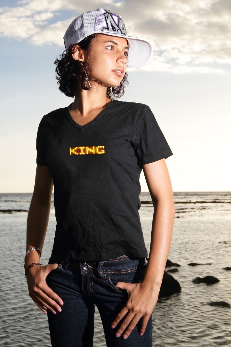 The t-shirt on sale has led a band inlaid, on which texts are displayed. The mini lights are very resistant, have a light that is visible during the day (not just in the dark). The t-shirt on sale comes with batteries and a battery life of 20 h. Choose speed, light level, or the type of movement of the LEDs. Convey the text you want, among other things with uncommon letters (empty hearts, suns, dollars ...). On this t-shirt on sale, 8 sentences of 512 signs can be saved. It's very simple, like writing an SMS, since small keys control the LEDs on the back of the screen light. By instructions in French you will still be given as a precaution.