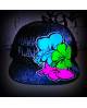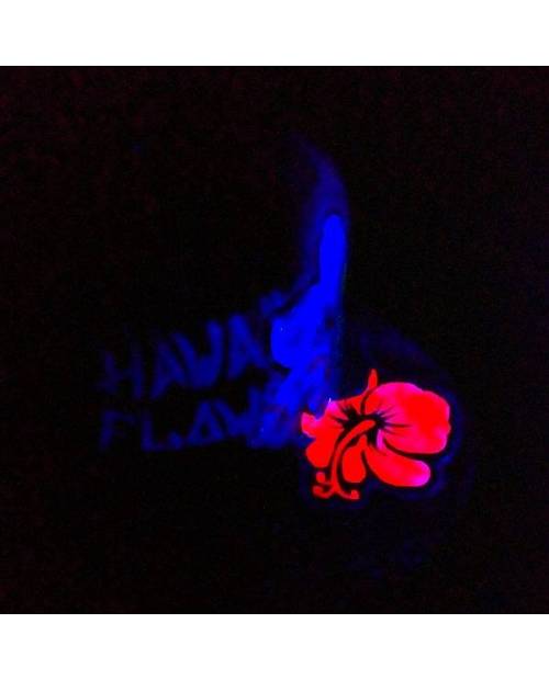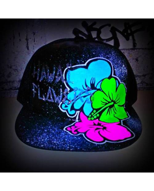 The surf cap with flower motifs neon that react to black light! Plus a tag in silver sequins that pays tribute to Hawaii.