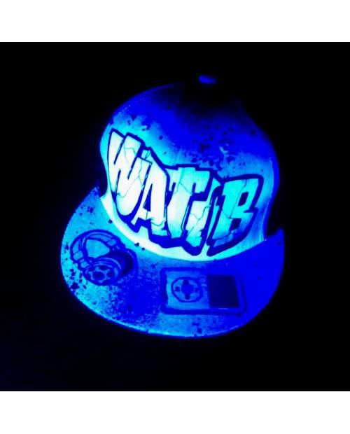 The cap may also be suitable for a child because it is adjustable in the back. It is decorated with features that react to UV black light.