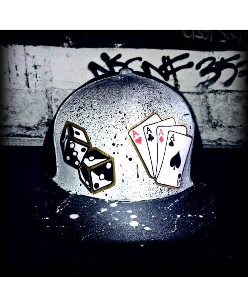 Our specimen of the stamp poker hat, to wear day and night. The cap is blank first, then the background can be established. Then the design is registered. Finally, the fine tuning, such as tasks, and the effects are created. Each of our hats are manufactured by our creator Arnaud. And all models are unique, you will not see two similar models!