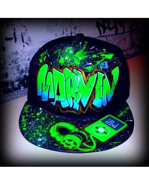 It is a model of man flat cap brand HJK, put 24h/24. Our cap is nothing on it at the base, then the stage is set as official DJ. Then, graffiti can be done. Finally, the fine tuning, such as tasks, and the effects are added. All caps are made by hand by our creator Arnaud. Thus each of our copies is unique, you will not meet two similar models!