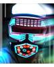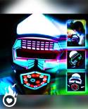 The electroluminescent mask consists of a logo with equalizer bars that animate from top to bottom. It is connected to a mini microphone with its volumetric receiver. The mask animates according to the sound power! This mask is shaped to fit well when the client is in motion.