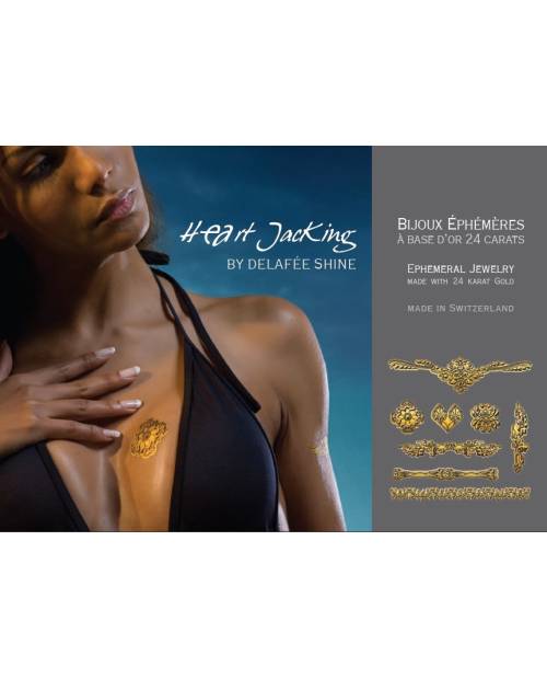 Ces bijoux ephemeres d’une extrême finesse suivent harmonieusement tous les contours et mouvements de votre peau. Le bijou ephemere or Heart JacKing / DeLafée s’applique très simplement sur le corps par un procédé de décalcomanie.