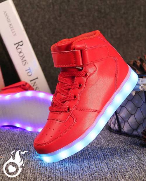 Ces sneakers hautes avec lumière pourront se marier avec un jean, un pantalon, un bas de survêtement, une jupe ou même une robe, grâce à leurs couleurs. En effet, la matière de notre nouvelle paire de shoes originale est le cuir, qui est alors teinté en noir, en blanc, ou encore en rouge, bleu, rose, or, argent, au choix ! Ce qui facilite grandement l’association avec vos vêtements !
