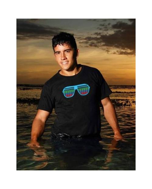 Tee shirt lumineux interactif Lunettes : design fibre optique résistante qui s'anime et s'allume avec le volume sonore, ou même sans (système introuvable autre part). Le top pour les discothèques, festivals, pour les DJs... Nombreux autres tee-shirts lumineux dispo. Les t-shirts taillent normalement, prenez votre taille habituelle. 100% coton, la plus haute qualité du marché. Autonomie de 20-25h.