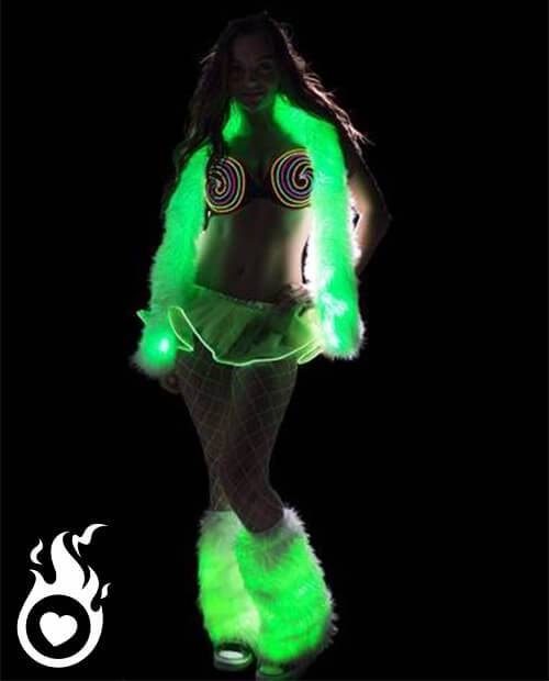 Vous vous rendez souvent à de superbes soirées ou encore à des festivals et vous avez envie de porter des vêtements jamais vus ? Choisissez des articles lumineux. Cette tenue lumineuse femme est constituée de 4 vêtements réellement lumineux : un soutien gorge, un boa, un tutu et des guêtres. Achetez ceux qui vous plaisent çi dessous et obtenez une réduction pour achat groupé !