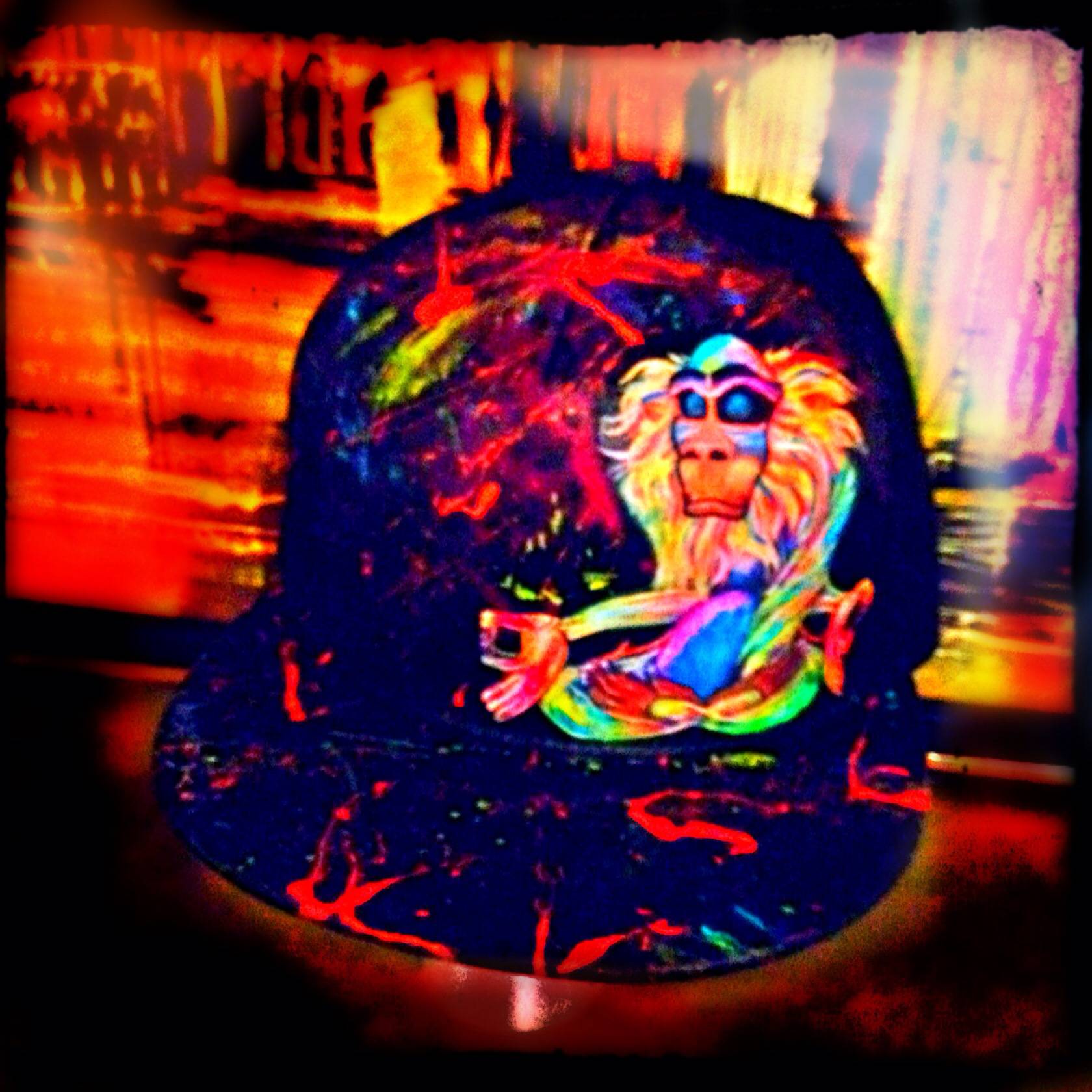 Casquette street art, nous personnalisons pour vous ! Type de casquette (New Era, Snapback, Filet...) + autre options (texte, couleurs...) au choix ! Comme toutes nos casquettes, cette casquette réagit à la lumière noire. La deuxième photo est sans trucage ! Casquette Rafiki du Roi Lion (Disney), le singe sage roi de la meditation ! Grand conseiller de Simba et Nala, il apporte les good vibes !