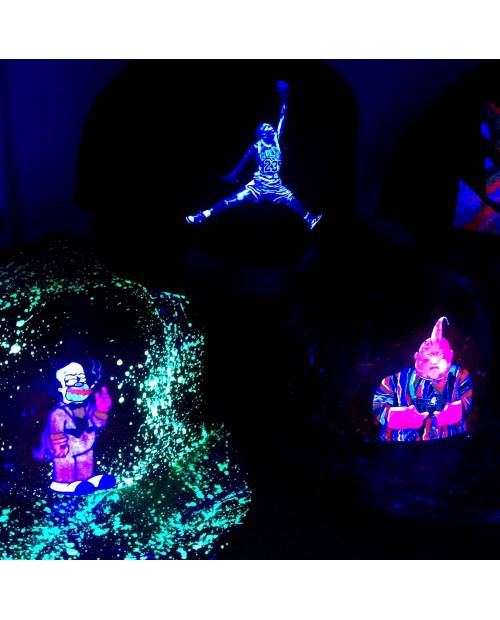 Obtenez votre propre casquette Heart Jacking unique, à porter 24 h/24, puisque cette casquette personnalisée pour vous réagit a la lumière noire ! Comme toutes nos casquettes d’ailleurs. Voici comment le graffeur crée les casquettes custom de nos clients. Tout d’abord, il enduit le devant de la casquette d’une substance qui permettra à la peinture de tenir en surface. Ensuite, il s’agit de travailler sur le design, le texte ou le logo fourni. Puis la casquette est protégée, et c’est au tour du fond/background d’être peint. Enfin, les finitions sont faites, à la main également, avec précision et grand soin. Chaque casquette est customisée pour le client, de manière artisanale par notre designer. Ainsi chaque casquette est unique, vous ne verrez pas 2 modèles identiques, même au sein de notre propre gamme !