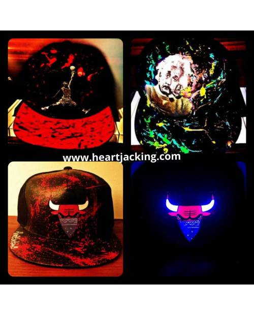 Obtenez votre propre casquette Chicago Bulls Bandana Heart Jacking unique, à porter 24 h/24, puisque cette casquette personnalisée par Coco Le Crack pour vous réagit a la lumière noire ! Comme toutes nos casquettes d’ailleurs. Voici comment le graffeur crée les casquettes custom de nos clients. Tout d’abord, il enduit le devant de la casquette d’une substance qui permettra à la peinture de tenir en surface. Ensuite, il s’agit de travailler sur le design, le texte ou le logo fourni. Puis la casquette est protégée, et c’est au tour du fond/background d’être peint. Enfin, les finitions sont faites, à la main également, avec précision et grand soin. Chaque casquette est customisée pour le client, de manière artisanale par notre designer. Ainsi chaque casquette est unique, vous ne verrez pas 2 modèles identiques, même au sein de notre propre gamme !