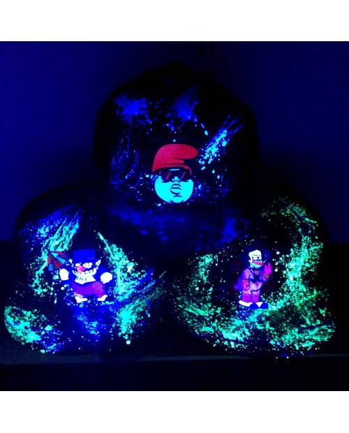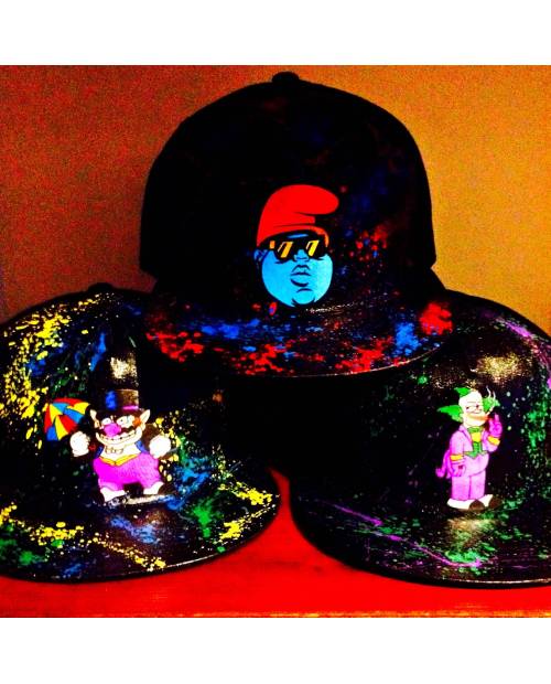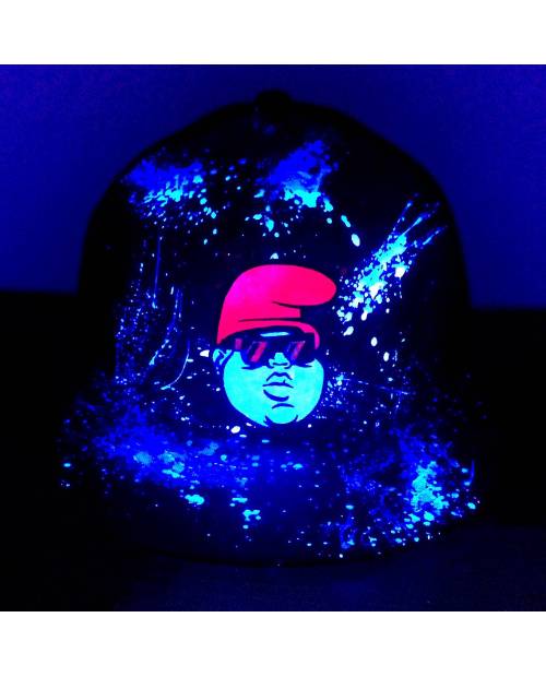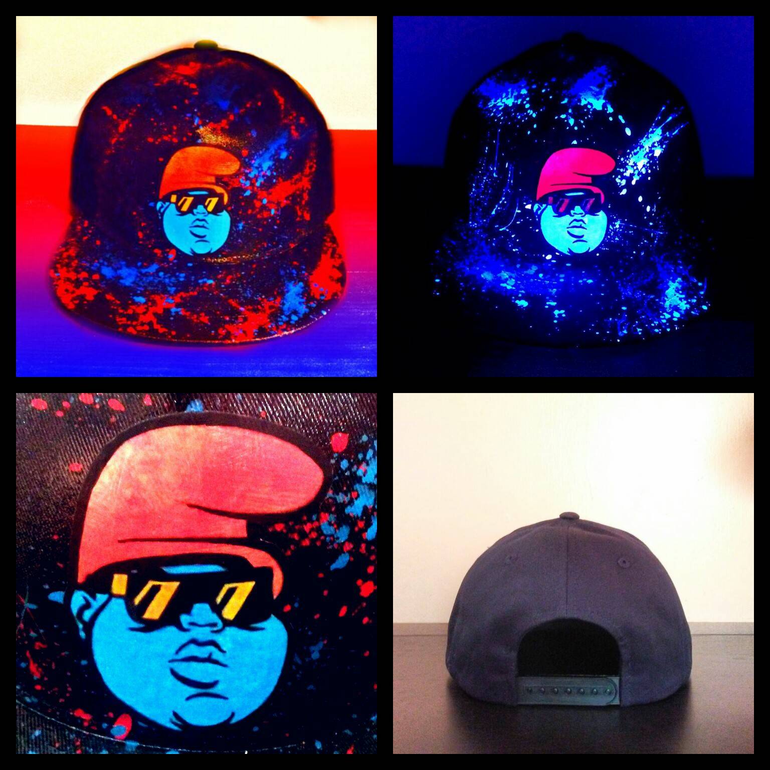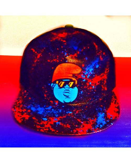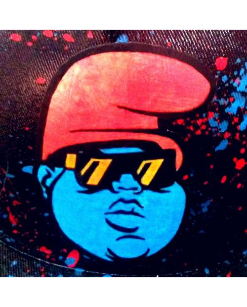 Casquette Notorious Big x Grand Schtroumf ! Chaque casquette est peinte à la main, chacune de nos casquettes est donc unique ! Nos casquettes s’illuminent grace à l'effet lumière noire : voyez nos photos. Obtenez votre propre casquette Biggie Smalls ou autres, nous customisons pour vous ! Choisissez le type de casquette, les coloris etc ! Les gens vont se retourner sur vous dans la rue.