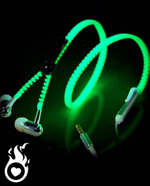 Écouteurs phosphorescents lumineux fermeture éclair, qui brillent dans la nuit. N'emmêllez plus vos fils ! Écoutez un son de qualité en stéréo. Plus pratique qu'un casque audio. Kit mains libres, microphone et réglage du volume inclus. Retrouvez facilement vos écouteurs même dans le noir. Compatible tout appareil (prise jack 3.5 mm classique). Plusieurs couleurs disponibles. 1.2m de long !