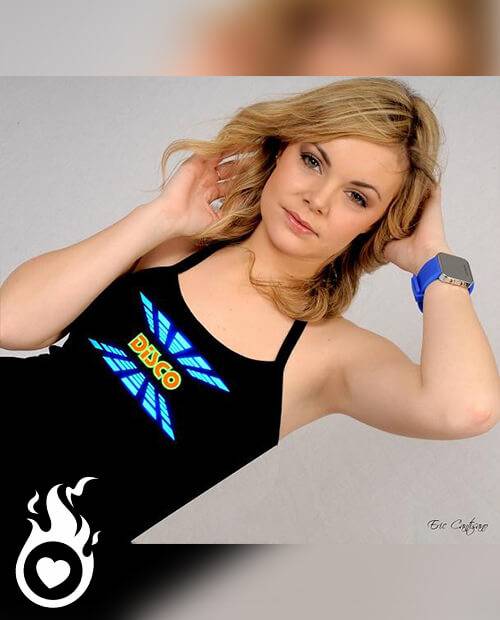 Agrandir l'image Ce haut pour femme réagit à la musique en s'éclairant ! Disco fever ! T-shirt bleu, jaune avec une pointe d'orangé, et une écriture très funky et disco.