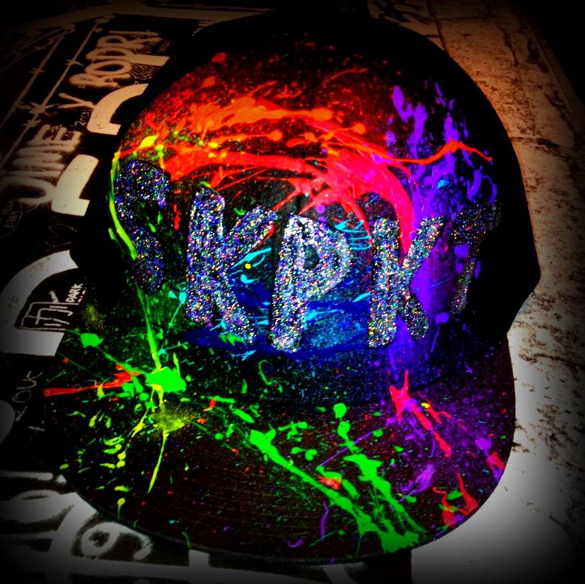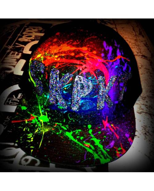 Une des références casquette de la boutique Heart JacKing, à porter de jour comme de nuit. La casquette est sans dessin au début, puis le fond est conçu. Ensuite, le graff est créé. En dernier lieu, la finition (les éclaboussures, les effets...) sont mis en place.Toutes les casquettes ont été créées par notre artiste designer. Ainsi chaque modèle est singulier, vous ne croiserez pas plusieurs références semblables !