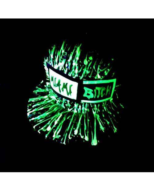 Casquette noire à visière aplatie. Ce modèle casquette comporte le texte et le symbole de Miami Bitch en graff. La lumière uv mettra en avant les couleurs fluorescentes de cet accessoire, comme sur la 2ème image.