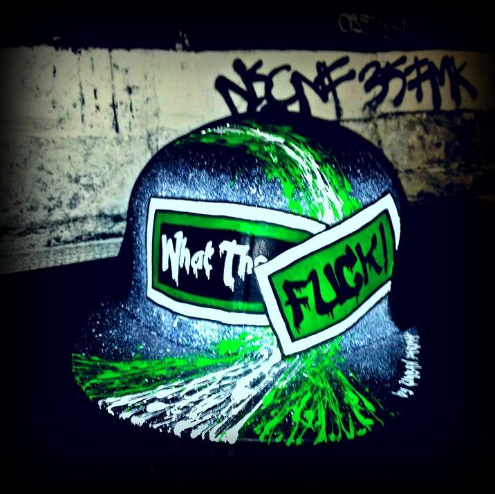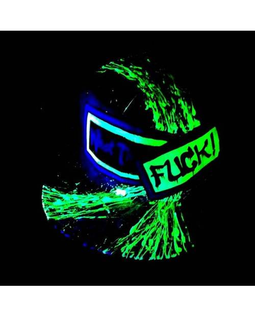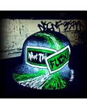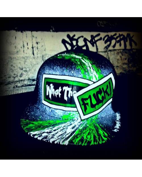 La casquette unique What the fuck en anglais comprend plusieurs couleurs pour être le plus visible possible. Les traits verts fluo réagissent à la lumière noire.