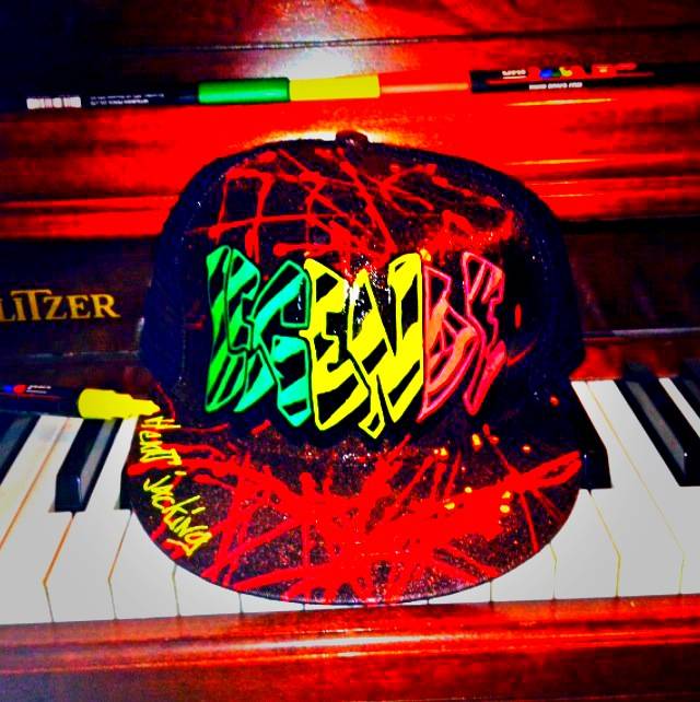 C'est un modèle de casquette originale de la marque HJK à mettre 24h/24. Notre casquette est sans rien dessus à la base, puis le décor est créé. Ensuite, le graff peut être fait. Enfin, le fignolage, comme les taches, ou encore les effets, est créé.