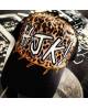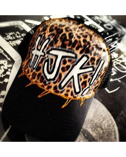 C'est LE modèle de casquette de la marque HJK, accessoire léopard à mettre 24h/24. Notre accessoire est sans rien dessus à la base, puis le décor est créé. Ensuite, le graff peut être fait. Enfin, le fignolage, comme les tâches, ou encore les effets, sont installés .