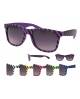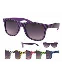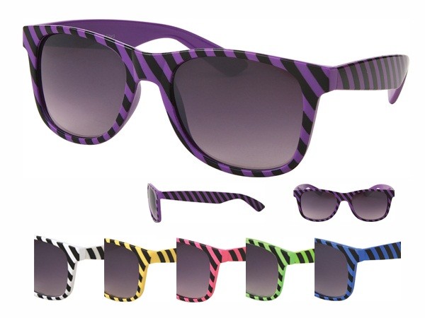La paire de lunettes montrées ici sont en plastique solide avec des motifs rayures noires, et à disposition dans les coloris ci-après : violet, blanc, jaune, rose, vert et bleu.